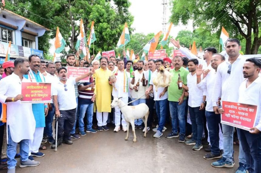 जगदलपुर। जगदलपुर में कांग्रेस ने गुरूवार को SDM कार्यालय का घेराव किया। पीसीसी चीफ दीपक बैज देसी दारू, मुर्गा और बकरा लेकर SDM कार्यालय पहुंचे। इस दौरान बड़ी संख्या में कांग्रेस समर्थकों ने सरकार और प्रशासन के खिलाफ जमकर नारेबाजी कर प्रदर्शन किया। पीसीसी चीफ दीपक बैज ने इस दौरान कहा कि अगर चित्रकोट में बीजेपी का सरपंच होता तो जी सर, जी सर कह कर मुर्गा, बकरा का बंदोबस्त कर देता। लेकिन भंवर मौर्य ने मना कर दिया तो FIR दर्ज कर दी। (Congress Protest)