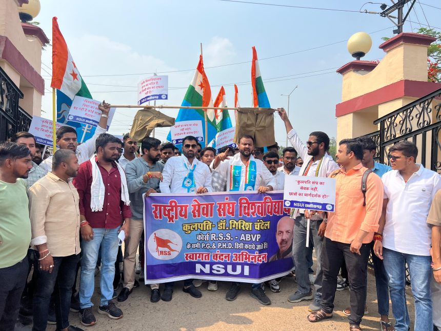 रायपुर। छत्तीसगढ़ के इंदिरा गांधी कृषि विश्वविद्यालय का छात्र संगठन NSUI ने घेराव किया। NSUI ने विश्वविद्यालय प्रशासन और कुलपति पर गंभीर आरोप लगाए। NSUI नेताओं का कहना है कि विश्वविद्यालय को RSS कार्यालय बना दिया गया है। कुलपति संघी विचारधारा के हैं। इसके चलते संघ और ABVP का कार्यक्रम इस विश्वविद्यालय में होता रहता है।