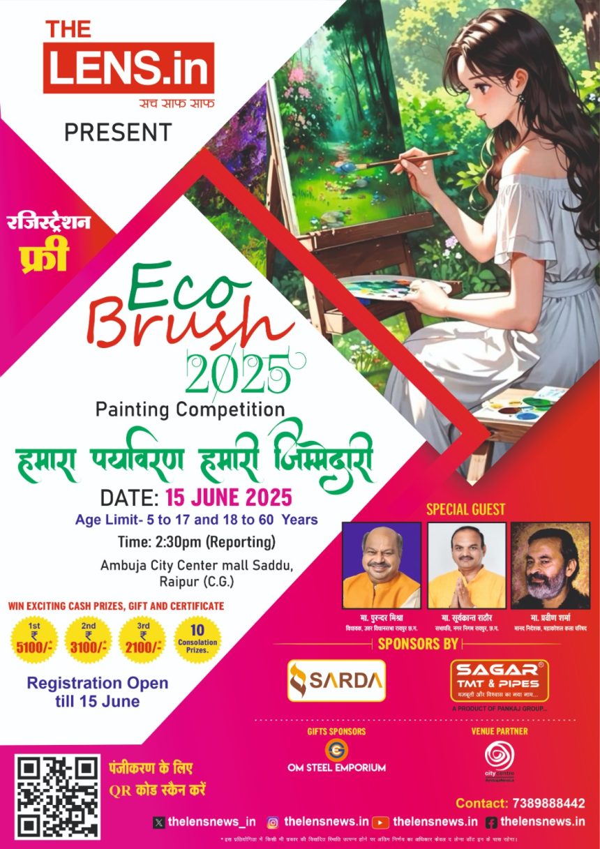 रायपुर। राजधानी रायपुर में The lens.in द्वारा पर्यावरण संरक्षण थीम पर पेंटिंग प्रतियोगिता का आयोजन किया जा रहा है। 15 जून को होने वाले ECO Brush-2025 में प्रतिभागी बढ़- चढ़कर हिस्सा ले रहें हैं। इस कार्यक्रम में मुख्य अतिथि रायपुर उत्तर के विधायक पुरंदर मिश्रा, नगर निगम के सभापति सूर्यकांत राठौर और महाकौशल कला परिषद के निर्देशक प्रवीण शर्मा शामिल होंगे। ECO Brush-2025