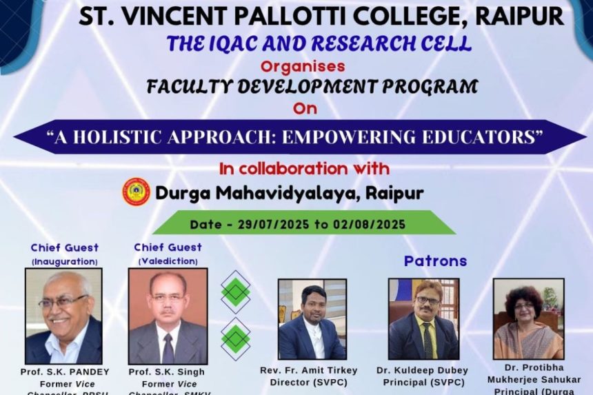 रायपुर. सेंट विन्सेंट पैलोटी कॉलेज St. Vincent Pallotti College एवं दुर्गा महाविद्यालय के संयुक्त तत्वावधान में 29 जुलाई से 2 अगस्त 2025 तक पांच दिवसीय फैकल्टी डेवलपमेंट प्रोग्राम का आयोजन किया जा रहा है ।महाविद्यालय के प्राचार्य डॉक्टर कुलदीप दुबे ने बताया कि कार्यक्रम का मुख्य विषय “होलिस्टिक एप्रोच: एम्पोवेरिंग एडुकेटर्स” है। कार्यक्रम का मुख्य उद्देश्य शिक्षकों को ” इमोशनल इंटेलिजेंस फॉर एडुकेटर्स” से समृद्ध करना है उद्धघाटन समारोह में प्रो. एस. के. पांडे, पूर्व कुलपति, पं. रविशंकर शुक्ल विश्वविद्यालय, रायपुर एवं समापन समारोह में प्रो. एस. के. सिंह, पूर्व कुलपति, शहीद महेन्द्र कर्मा विश्वविद्यालय, बस्तर, मुख्य अतिथि के रूप में उपस्थित रहेंगे।