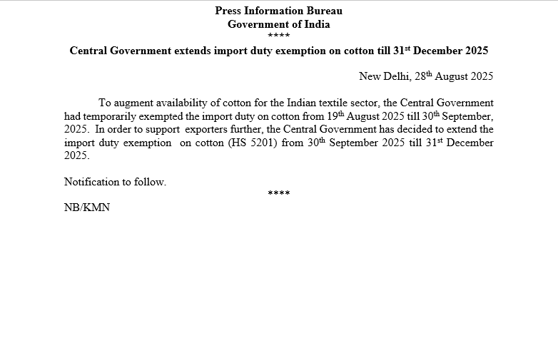 कपास के आयात पर कुल 11 प्रतिशत शुल्क लागू था, जिसमें 5 प्रतिशत मूल सीमा शुल्क (बीसीडी), 5 प्रतिशत कृषि अवसंरचना और विकास उपकर (एआईडीसी) इन दोनों पर 10 प्रतिशत सामाजिक कल्याण अधिभार शामिल था। सरकार ने अब इन सभी करों को हटा दिया है।
