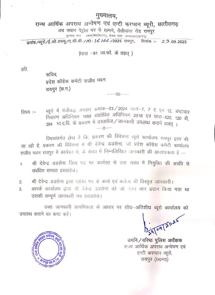 नोटिस में शराब घोटाले में ईओडब्ल्यू में की गई एफआईआर का ब्यौरा देते हुए कहा गया है कि मामले की जांच में ब्यूरो कार्यालय द्वारा की जा रही विवेचना में प्रदेश कांग्रेस कमेटी कार्यालय राजीव भवन रायपुर में कार्यरत देवेंद्र डड़सेना के संबंध जानकारी दी जाए।