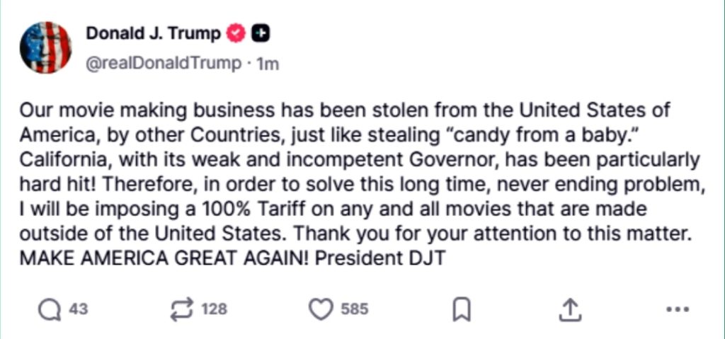 लेंस डेस्‍क। Trump tariff on films: अमेरिकी राष्ट्रपति डोनाल्ड ट्रंप ने सोमवार को ऐलान किया कि विदेशों में बनने वाली सभी फिल्मों पर अब 100 प्रतिशत आयात शुल्क लगेगा। उन्होंने अपने सोशल मीडिया मंच ट्रुथ सोशल पर एक पोस्ट में लिखा, “बाहर के देशों ने हमारा फिल्म निर्माण का कारोबार चुरा लिया है, जैसे कोई बच्चे से उसकी मिठाई छीन लेता है।”