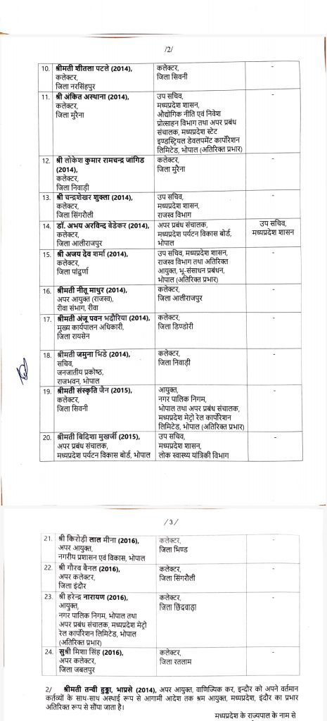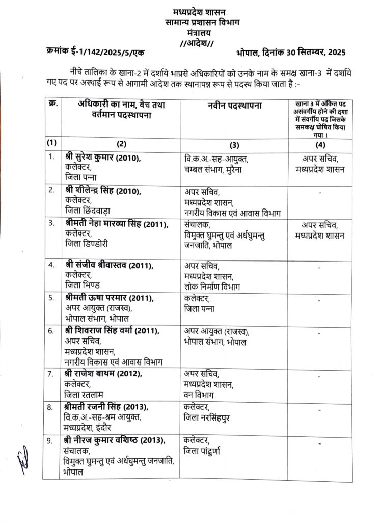 जिन 12 जिलों के कलेक्टर बदले गए, उनमें पन्ना, नरसिंहपुर, पांढुर्णा, सिवनी, मुरैना, अलीराजपुर, डिंडोरी, निवाड़ी, भिंड, सिंगरौली, छिंदवाड़ा और रतलाम शामिल है।