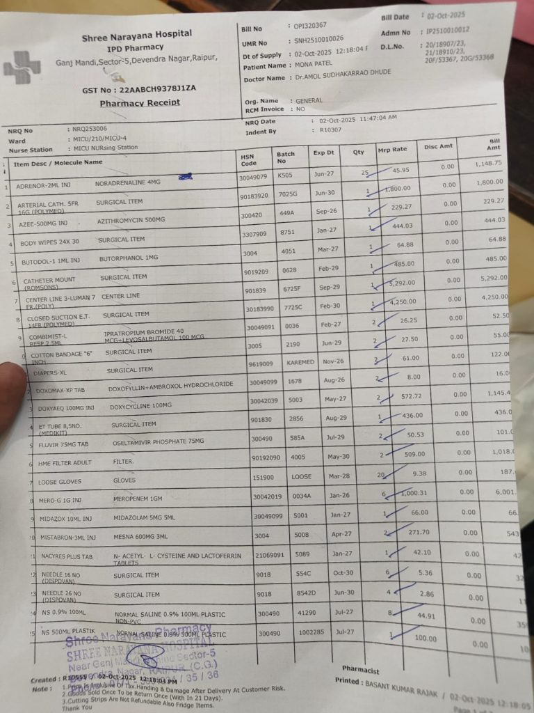 रायपुर। छत्तीसगढ़ की राजधानी रायपुर में श्री नारायणा अस्पताल में पुरानी एमआरपी में ही दवाइयां और मेडिकल सामग्रियां बेचने का मामला सामने आया है। 22 सितंबर को जीएसटी की दर कम करने के बाद भी अस्पताल में दवाइयां में नए दर के अनुसार दवाइयां और सामग्रियां नहीं बिक रही। इससे ग्राहकों को जीएसटी छूट का लाभ नहीं मिल रहा है।