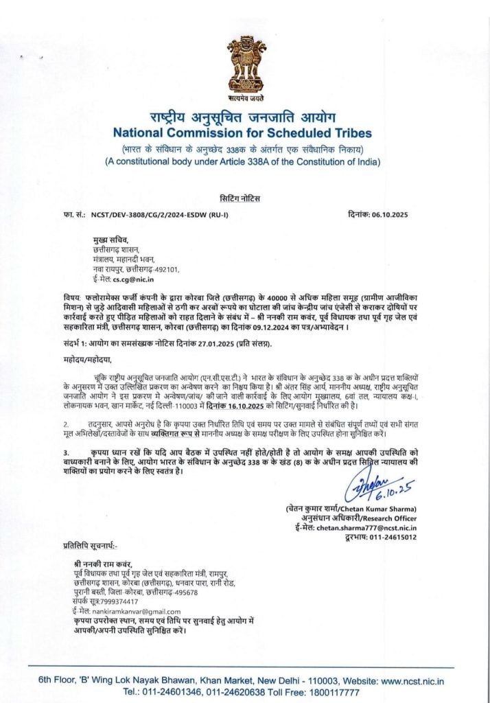 मुख्य सचिव को एनसीएसटी का 6 अक्टूबर को भेजा गया नोटिस है, जिसमें कोरबा जिले में फ्लोरामेक्स फर्जी कंपनी के 40 हजार महिलाओं के साथ ठगी से जुड़ी थी, जिसमें ननकी राम कंवर ने कोरबा कलेक्टर अजीत वसंत पर भ्रामक और झूठी जानकारी देने का आरोप लगाया था।
