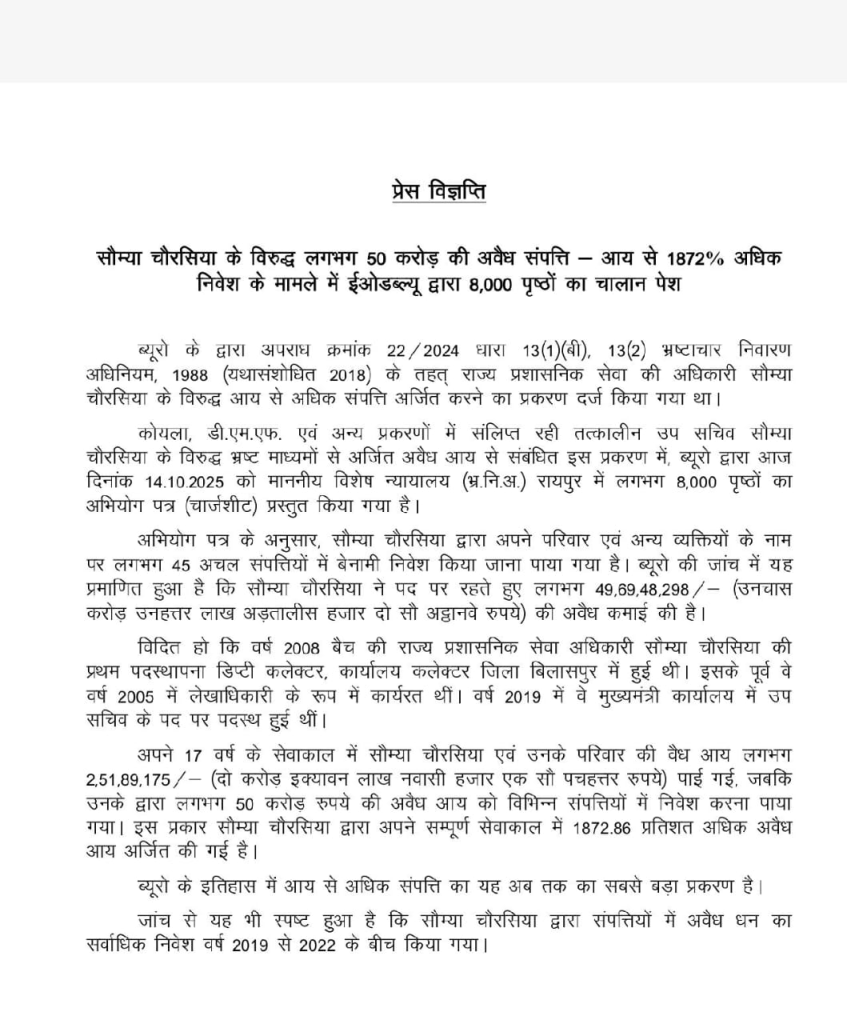 रायपुर। छत्तीसगढ़ की आर्थिक अपराध शाखा (EOW) ने एक चौंकाने वाले मामले में कोर्ट में 8,000 पेजों का मोटा चालान दाखिल किया है। इस चालान का केंद्र बिंदु राज्य प्रशासनिक सेवा की पूर्व अधिकारी सौम्या चौरसिया हैं, जिन पर अपनी सैलरी से कहीं ज्यादा 50 करोड़ रुपये की संपत्ति जुटाने का गंभीर आरोप लगा है। ईओडब्ल्यू का दावा है कि यह मामला राज्य के इतिहास का सबसे बड़ा आय-से-अधिक-संपत्ति का केस है।