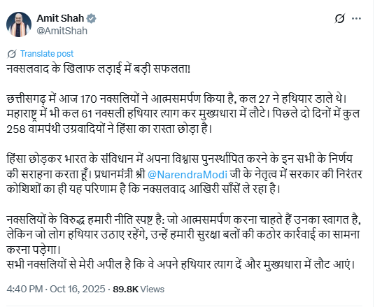 इस सरेंडर कार्यक्रम से एक दिन पहले केंद्रीय गृह मंत्री अमित शाह ने अबूझमाड़ और उत्तरी बस्तर को नक्सली आतंक से मुक्त घोषित कर दिया था। अमित शाह ने एक्स पर पोस्ट करते हुए इसकी घोषणा की थी।