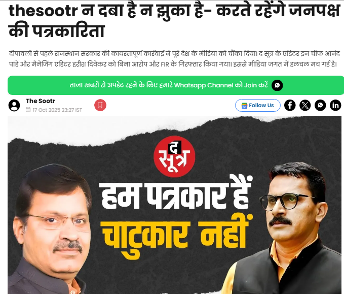दीपावली के त्योहार के ठीक एक दिन पहले राजस्थान सरकार की कायरना हरकत के कारण पूरे देश का मीडिया हैरान है। न कोई आरोप, न FIR, इसके बावजूद राजस्थान पुलिस ने नियम – कायदों को ताक पर रखकर द सूत्र के एडिटर इन चीफ आनंद पांडे और मैनेजिंग एडिटर हरीश दिवेकर को हिरासत में ले लिया।