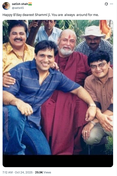 निधन से एक दिन पहले सतीश ने एक्स पर एक तस्वीर पोस्ट की थी, जिसमें वह गोविंदा और दिवंगत शम्मी कपूर के साथ नजर आ रहे थे। यह तस्वीर उन्होंने शम्मी कपूर की जयंती पर साझा की थी, जिसमें उन्होंने लिखा, “जन्मदिन की बधाई, शम्मी जी। आप हमेशा मेरे दिल के करीब हैं।”