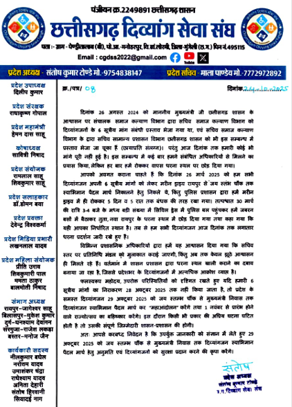 रायपुर की सड़कों पर दिव्यांगजन व्हीलचेयर, बैसाखियों और नारों के साथ मार्च कर रहे हैं, जिसमें महिलाएं, युवा और बुजुर्ग सभी शामिल हैं। यह आंदोलन अगस्त 2025 में मुख्यमंत्री विष्णु देव साय के आश्वासन के बाद स्थगित प्रदर्शन का विस्तार है लेकिन फर्जी प्रमाण-पत्रों पर कार्रवाई न होने और अन्य मांगों की अनदेखी से फिर से भड़का है।