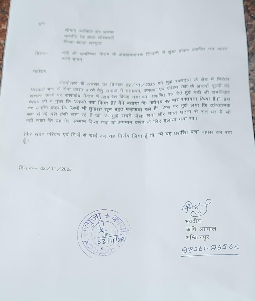 सरगुजा। छत्तीसगढ़ अपनी स्थापना के 25 साल पूरे होने के मौके पर जश्न मना रहा है। राजधानी रायपुर सहित हर जिले राज्योत्सव के कार्यक्रम हो रहे हैं। इस बीच सरगुजा में एक रक्तदाता युवक ने राज्योत्सव में सम्मानित होने के बाद प्रशस्ति पत्र जिला प्रशासन को वापस कर दिया यह कहते हुए कि सम्मान करते वक्त मंत्री राम विचार नेताम की भाषा व्यंग्यात्मक थी, जो कि बुरी लगी।