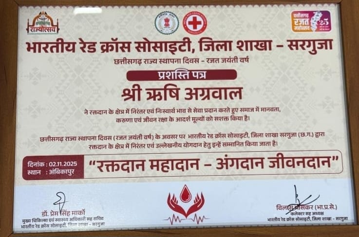 दरअसल अंबिकापुर के कला केंद्र मैदान में 2 नवंबर को राज्योत्सव के कार्यक्रम में कृषि मंत्री राम विचार नेताम शामिल हुए थे। इसी दौरान जिले के उन लोगों का सम्मान किया जा रहा था, जो समाजसेवा के लिए जाने जाते हैं। इसी में एक समाजसेवी ऋषि अग्रवाल जो 49 बार रक्तदान कर चुके हैं, उन्होंने आज कलेक्ट्रेट पहुंच कर प्रशस्ति पत्र वापस कर दिया।