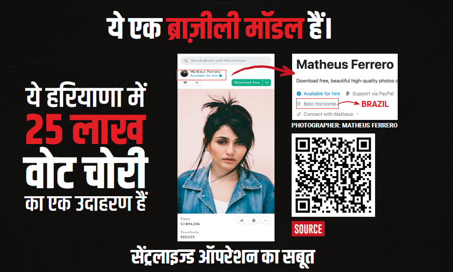 राहुल गांधी ने बाकायदा पीपीटी पर दिखाया कि ब्राजील की एक मॉडल के नाम पर 22 मतदाता कार्ड मिले हैं। एक ही फोटो वाले 22 कार्ड पाए गए। एक युवती के नाम पर दस मतदान केंद्रों पर मत डाले गए। कुल 22 बार मतदान हुआ। यह पूरी तरह सुनियोजित कार्रवाई थी। राज्य में पांच लाख इक्कीस हजार छह सौ उन्नीस दोहरे मतदाता हैं। राहुल ने पूद कि ब्राजील की मतदाता ने 22 जगह मत कैसे डाला। हर आठ में से एक मतदाता जाली था। यह मत हेराफेरी मतदान केंद्रों पर नहीं बल्कि केंद्रीकृत तरीके से हुई। एक महिला के नाम पर नौ जगह मत डाले गए।