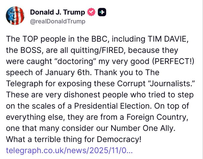 अमेरिकी राष्ट्रपति डोनाल्ड ट्रंप ने ब्रिटिश ब्रॉडकास्टिंग कॉर्पोरेशन यानी बीबीसी के दो प्रमुख पदाधिकारियों टिम डेवी और डेबोरा टर्नेस के पदत्याग पर तीखी टिप्पणी की है। 6 जनवरी 2021 के अपने संबोधन को शानदार और बेहतरीन बताते हुए राष्ट्रपति ने इस घटना को लोकतंत्र के लिए खतरनाक कदम करार दिया।
