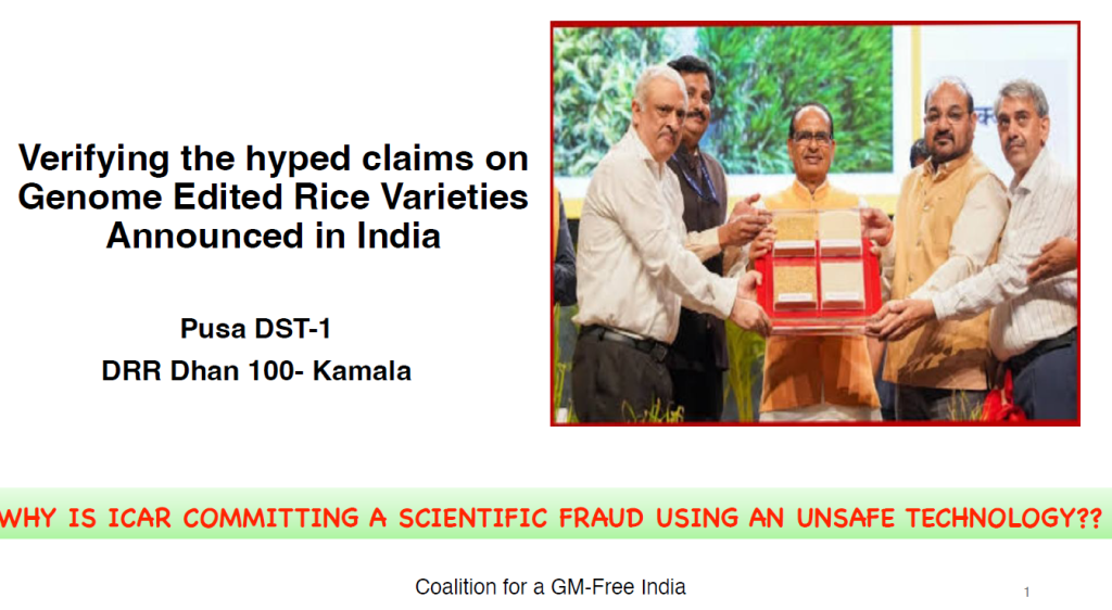 नई दिल्ली। भारत में हाल ही में घोषित जीन संपादित चावल की दो नई किस्मों – पूसा डीएसटी-1 और डीआरआर धान 100 (कमला) पर गंभीर सवाल उठाए गए हैं। जीएम-फ्री इंडिया गठबंधन नामक संगठन ने हाल ही में एक रिपोर्ट जारी की है, जिसमें इन किस्मों के बारे में किए गए बड़े-बड़े दावों को झूठा और असत्यापित बताया गया है।