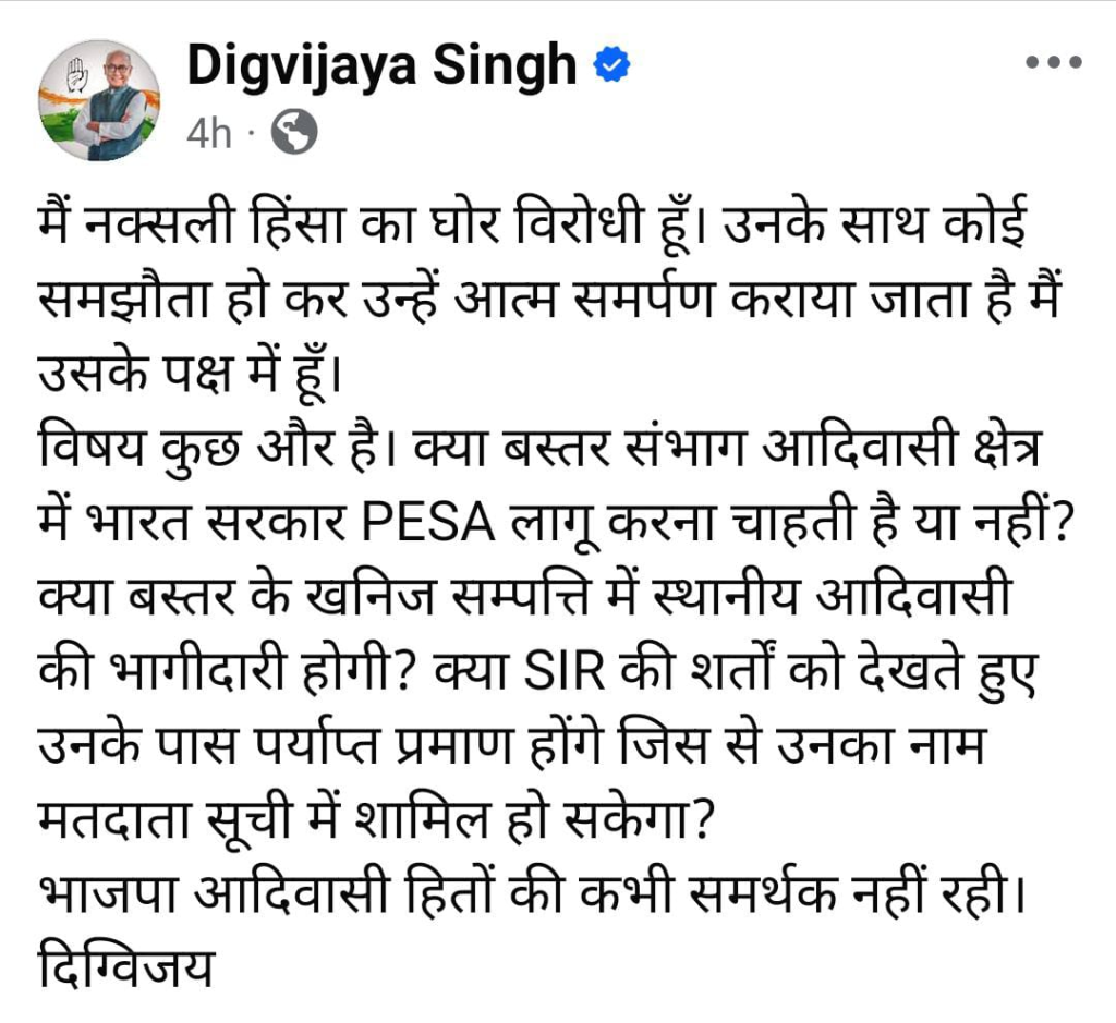 दिग्विजय सिंह ने पोस्ट में कहा, “मैं नक्सली हिंसा का घोर विरोधी हूं। उनके साथ कोई समझौता हो कर उन्हें आत्म समर्पण कराया जाता है मैं उसके पक्ष में हूं। विषय कुछ और है। क्या बस्तर संभाग आदिवासी क्षेत्र में भारत सरकार PESA लागू करना चाहती है या नहीं? क्या बस्तर के खनिज सम्पत्ति में स्थानीय आदिवासी की भागीदारी होगी? क्या SIR की शर्तों को देखते हुए उनके पास पर्याप्त प्रमाण होंगे जिस से उनका नाम मतदाता सूची में शामिल हो सकेगा? भाजपा आदिवासी हितों की कभी समर्थक नहीं रही।”
