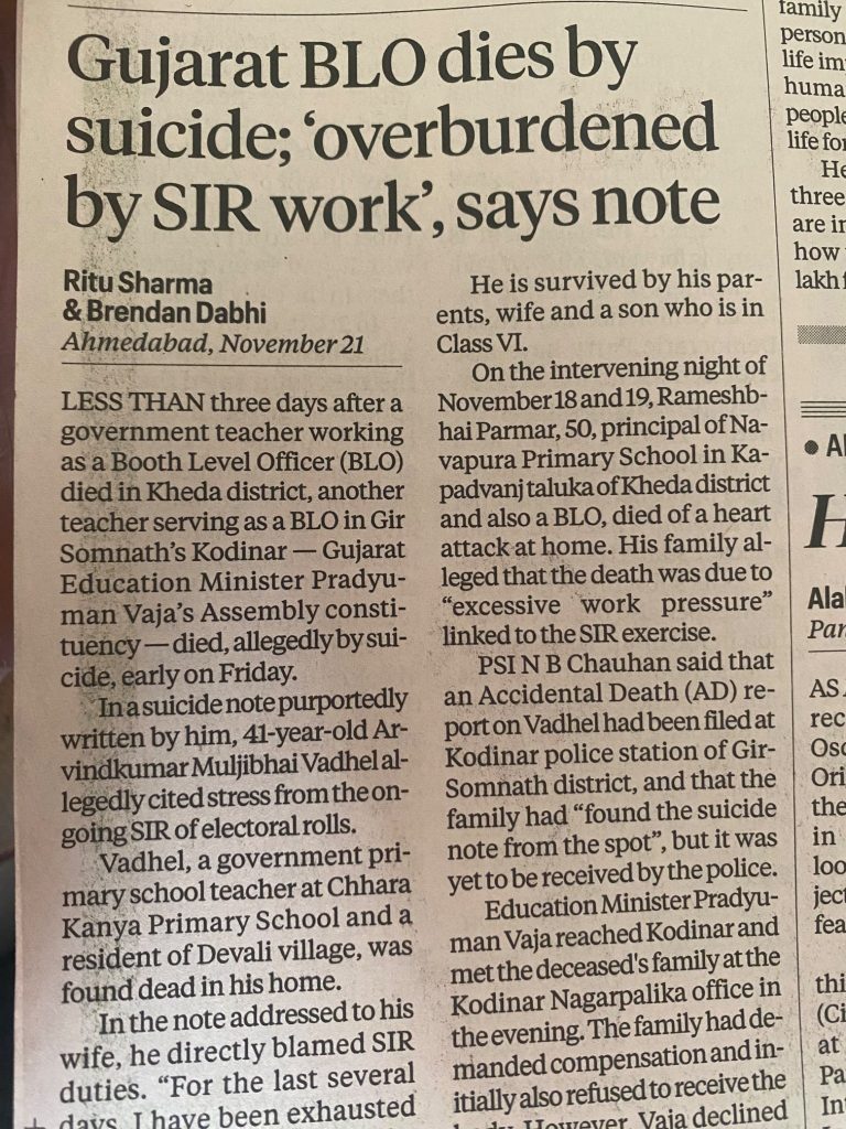 नवंबर से अब तक कम से कम 12 BLOs की मौत हो चुकी है आत्महत्या, हार्ट अटैक और ब्रेन स्ट्रोक से। सबसे ज्यादा मामले पश्चिम बंगाल, केरल, राजस्थान, गुजरात और मध्य प्रदेश से आए हैं। 22 नवंबर को पश्चिम बंगाल के नादिया जिले में 51 साल की पैरा-टीचर रिंकू तारफदार ने घर में फांसी लगा ली। सुसाइड नोट में उन्होंने साफ लिखा ‘SIR का दबाव सहन नहीं कर पा रही। ECI जिम्मेदार है।’