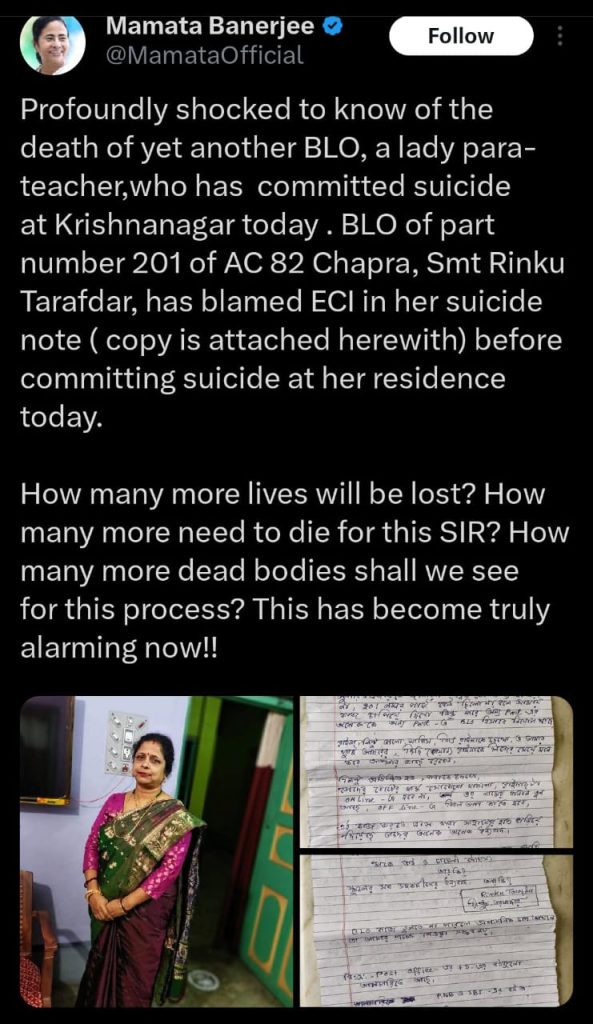 इसपर तृणमूल कांग्रेस का दावा है कि अक्टूबर से बंगाल में ही 28 BLO मौतें हो चुकी हैं। सीएम ममता बनर्जी ने X पर नोट की कॉपी शेयर करते हुए लिखा,’SIR के नाम पर और कितनी जानें जाएंगी? यह अब चिंताजनक स्तर पर पहुंच गया है। प्रक्रिया तुरंत रोकी जाए।’