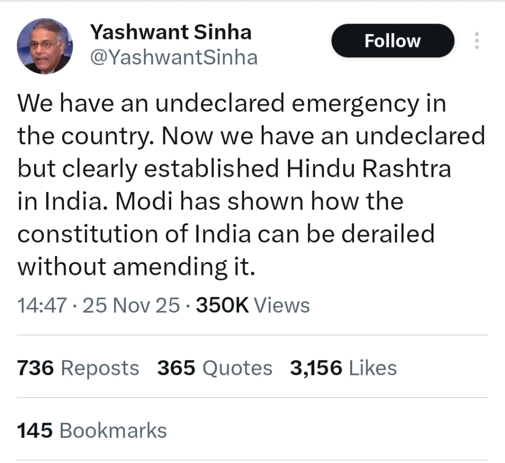 पूर्व वित्त मंत्री यशवंत सिन्हा ने संविधान दिवस के मौके पर बीजेपी पर तगड़ा हमला किया है। उन्होंने सोशल मीडिया प्लेटफार्म X पर लिखा है कि देश में अघोषित आपातकाल है। अब भारत में अघोषित लेकिन स्पष्ट रूप से स्थापित हिंदू राष्ट्र है। मोदी ने दिखा दिया है कि बिना संशोधन के भारत के संविधान को कैसे पटरी से उतारा जा सकता है।