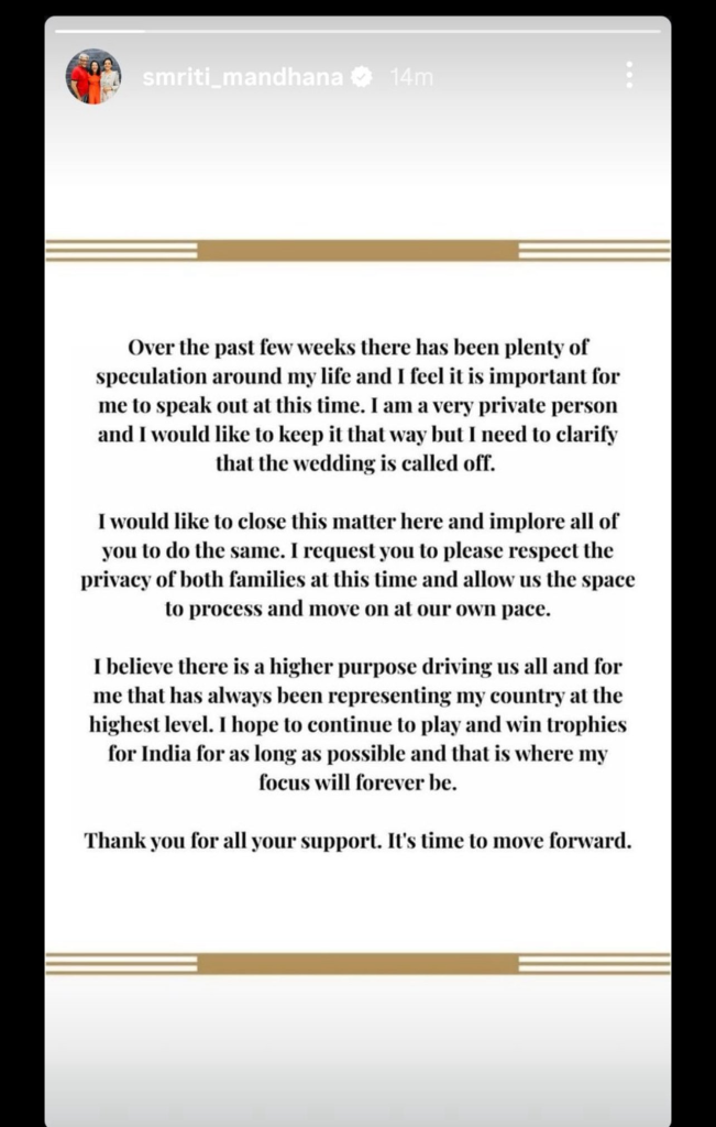 शादी टलने के बाद सोशल मीडिया पर धोखा और थर्ड पर्सन वाली अफवाहें जोरों पर थीं। स्मृति ने सभी शादी की तस्वीरें डिलीट कर दी थीं। 7 दिसम्बर रविवार को स्मृति ने लिखा ‘मैं निजता पसंद करने वाली इंसान हूं, लेकिन साफ करना जरूरी था कि शादी अब नहीं होगी। कृपया दोनों परिवारों की प्राइवेसी का सम्मान करें और हमें आगे बढ़ने का समय दें।’