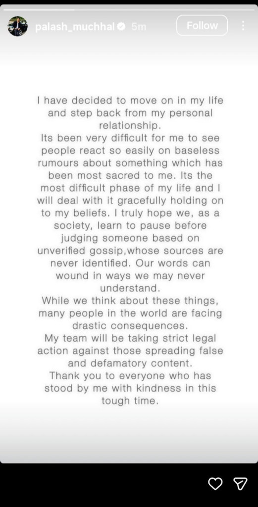 पलाश मुछाल ने भी लिखा कि यह उनके जीवन का सबसे मुश्किल दौर है। उन्होंने अफवाह फैलाने वालों के खिलाफ सख्त कानूनी कार्रवाई करने की बात कही। पलाश ने लिखा ‘मेरे लिए सबसे पवित्र रिश्ते पर बेबुनियाद बातें सुनना दुखद रहा। मेरी टीम झूठ फैलाने वालों पर एक्शन लेगी।’