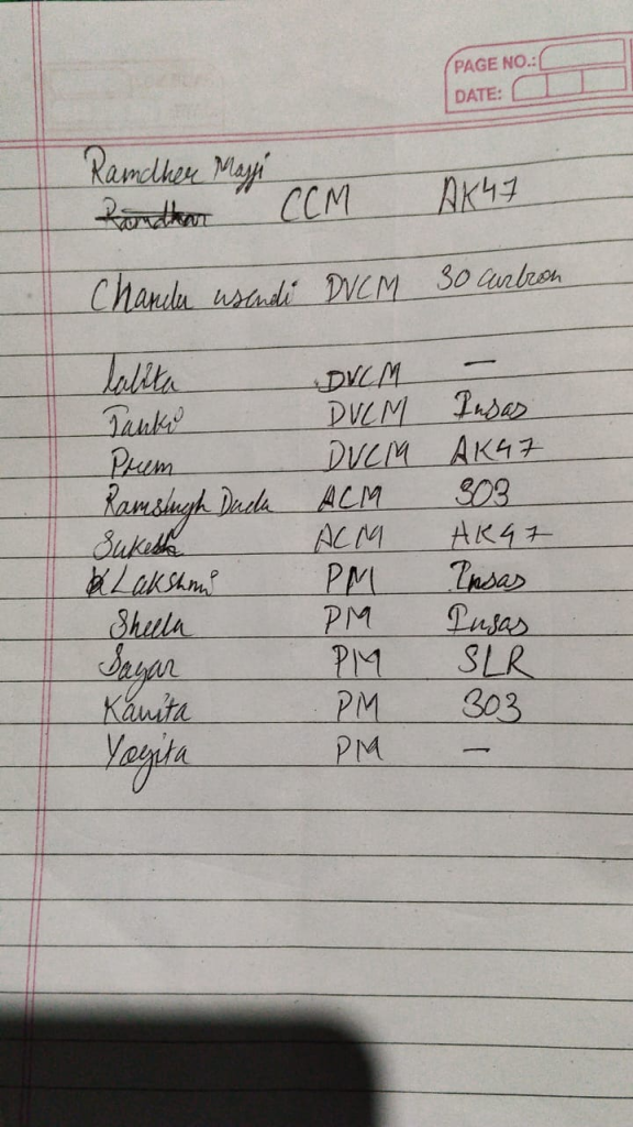 रामधेर मज्जी ने खुद AK-47 राइफल के साथ सरेंडर किया। उनके साथ आए शीर्ष कैडरों में डिविजनल कमेटी सदस्य (DVCM) रैंक की चंदू उसेंडी, ललिता, जानकी और प्रेम भी शामिल हैं। इनमें से दो के पास भी AK-47 और इंसास राइफल थी। इसके अलावा एरिया कमेटी मेंबर रामसिंह दादा और सुकेश पोट्टम ने भी हथियार डाले। सरेंडर करने वालों में महिला मिलिशिया की कमांडर लक्ष्मी, शीला, योगिता, कविता और सागर भी हैं। पुलिस ने इनसे AK-47, इंसास, SLR, 303 राइफल और कार्बाइन समेत कई हथियार बरामद किए हैं।