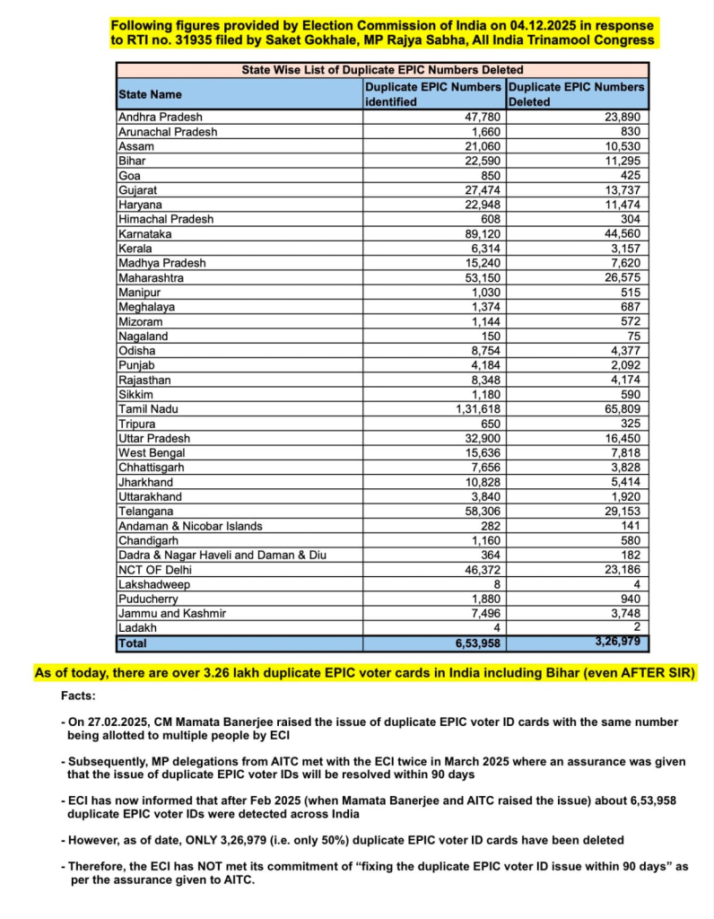 यदि चुनाव आयोग 7 महीनों से अधिक समय में 3.26 लाख डुप्लिकेट ईपीआईसी मतदाता पहचान पत्र हटाने में विफल रहा है, तो वह कैसे दावा कर रहा है कि वह जल्दबाजी में तैयार किए गए 2 महीने के SIR के माध्यम से “मतदाता सूची को साफ” कर सकता है?