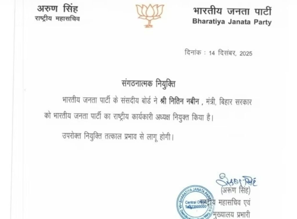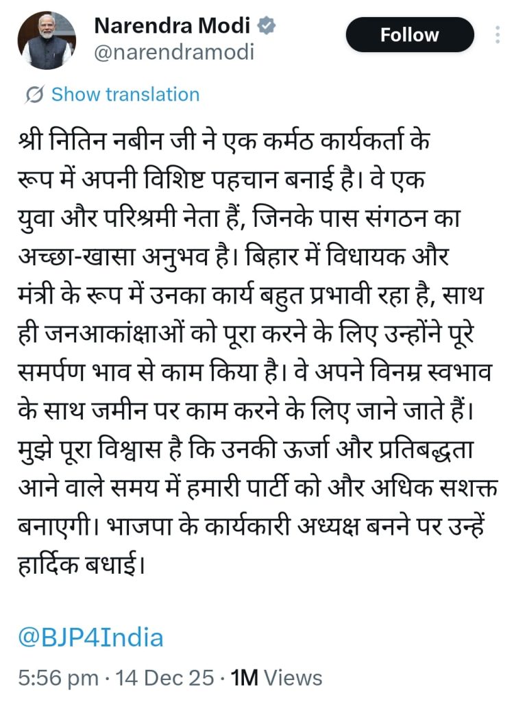 प्रधानमंत्री नरेंद्र मोदी ने सोशल मीडिया पोस्ट कर नितिन नबीन को बधाई दी और कहा–‘ नितिन नबीन जी ने एक कर्मठ कार्यकर्ता के रूप में अपनी विशिष्ट पहचान बनाई है। वे एक युवा और परिश्रमी नेता हैं, जिनके पास संगठन का अच्छा-खासा अनुभव है। ’